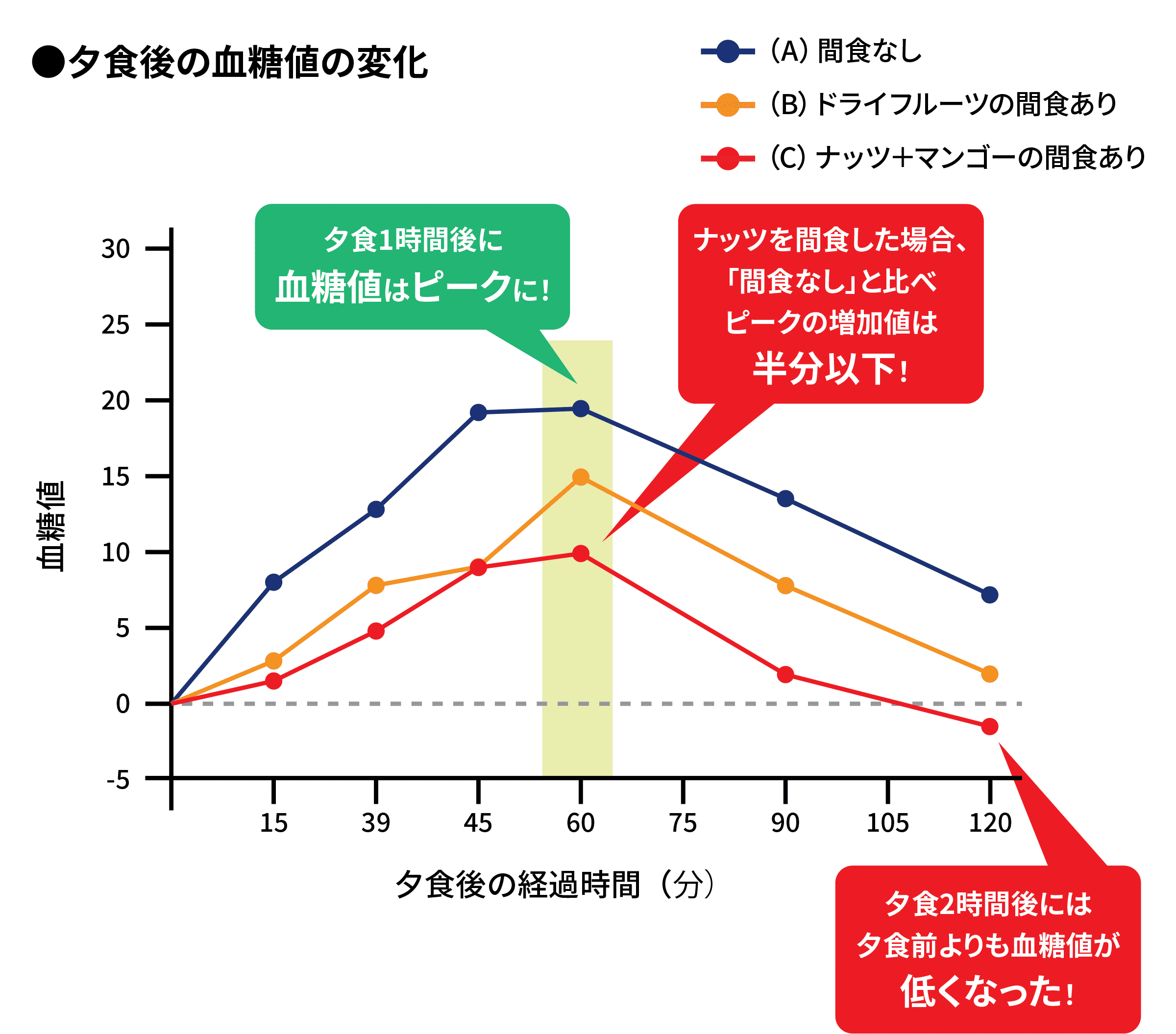 その結果、(A)〜(C)いずれも、夕食1時間後に血糖値はピークになりました。特に、「(C)ナッツ+マンゴーの間食あり」場合は、「(A)間食なし」と比較して、ピークの増加値は半分以下という結果がでました。また、「(C)ナッツ+マンゴーの間食あり」の場合、夕食2時間後には、夕食前よりも血糖値は低くなりました。