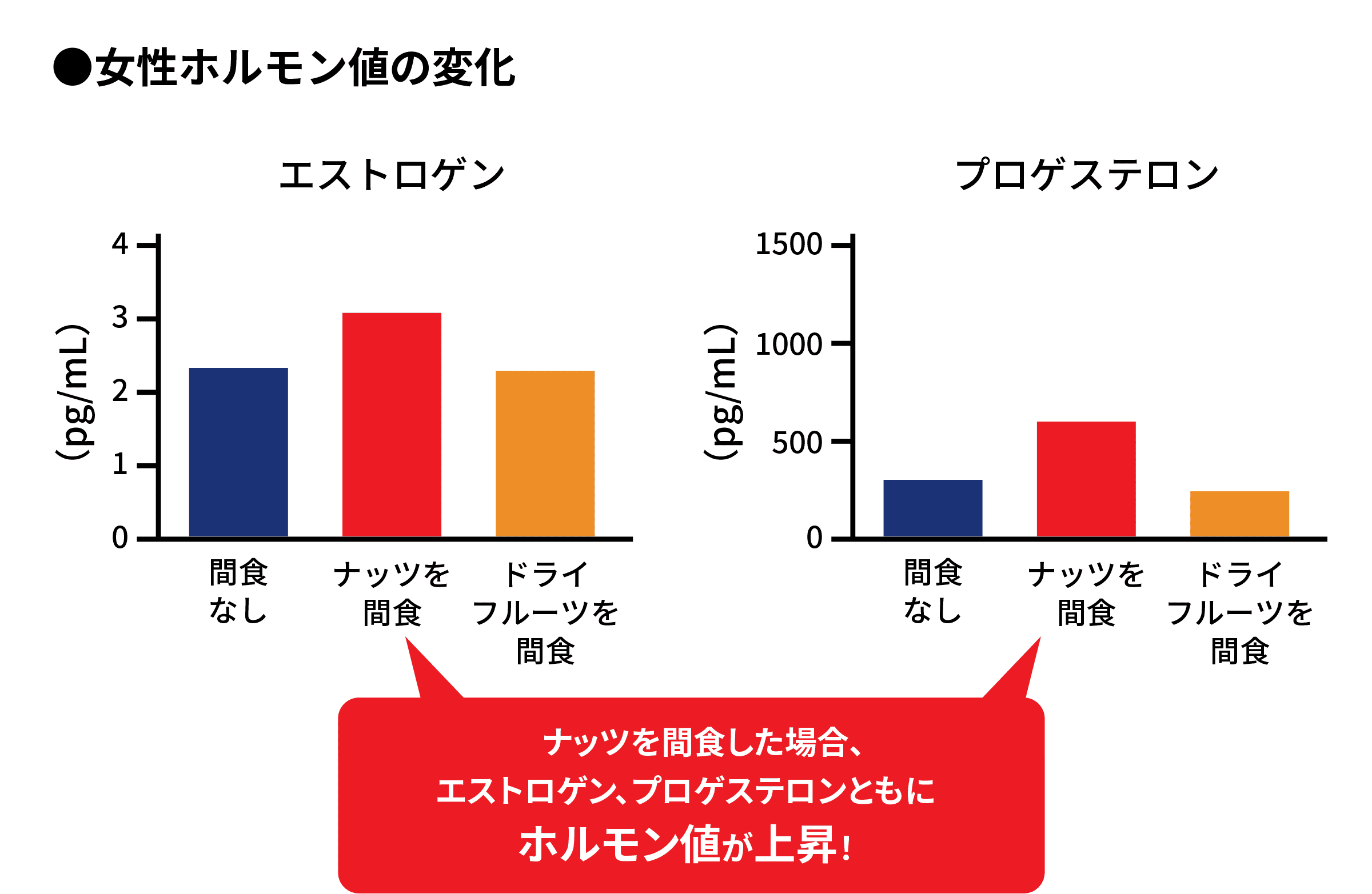 間食にドライフルーツを食べた場合は、ホルモン値の変化はほとんど見られませんでしたが、ナッツを間食した場合は、2つの女性ホルモンである「エストロゲン」、「プロゲステロン」ともにホルモン値の上昇が見られました。
