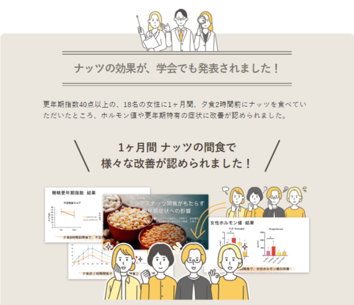 2024年5月「第78回日本栄養・食糧学会大会」で、古谷彰子博士、柴田重信教授、三代目店主小島靖久らが、更年期障害の症状にもたらすミックスナッツの影響についての研究結果を学会で発表いたしました。2ヶ月間の実験結果が大きな反響を呼びました。