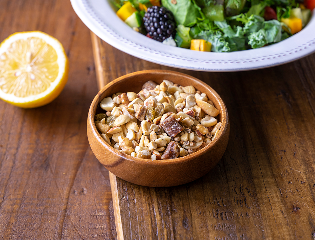 完成したサラダをおいしくするナッツ&ドライフルーツ