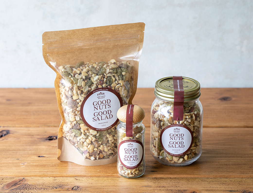 創業65年となるドライフルーツとナッツの専門店・小島屋と、人気フレンチ「sio」オーナーシェフ鳥羽周作が共同開発。サラダに特化した専用ナッツ「GOOD NUTS GOOD SALAD」を、2021年8月31日“野菜の日”に発売しました。選び抜かれた7種の素材が、サラダの美味しさと栄養価を引き立てる新感覚ミックスナッツです。