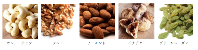 原材料名:カシューナッツ(インド産)、アーモンド、くるみ、グリーンレーズン、いちじく、クミン、コリアンダー、⽶粉