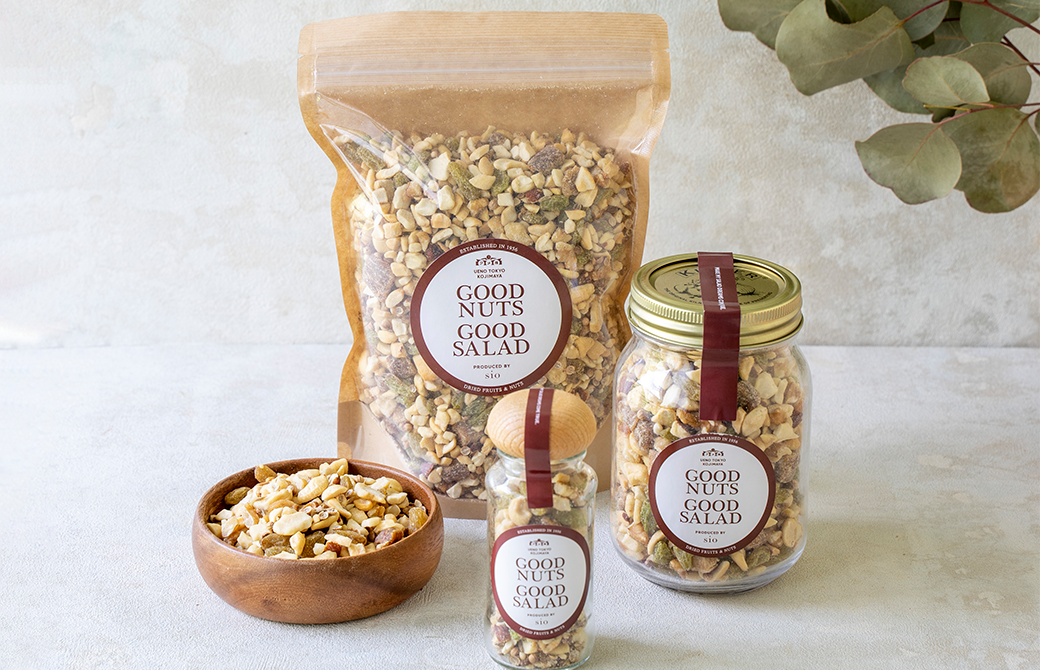 創業65年となるドライフルーツとナッツの専門店・小島屋と、人気フレンチ「sio」オーナーシェフ鳥羽周作が共同開発。サラダに特化した専用ナッツ「GOOD NUTS GOOD SALAD」を、2021年8月31日“野菜の日”に発売しました。選び抜かれた7種の素材が、サラダの美味しさと栄養価を引き立てる新感覚ミックスナッツです。