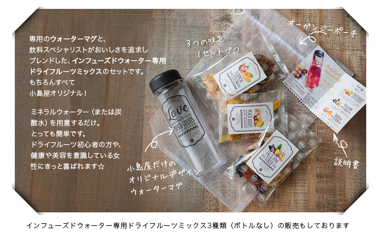 ナッツ&ドライフルーツの専門店である小島屋が、新たなドライフルーツの楽しみ方ができる商品を考えました!ミネラルウォーター(または炭酸水)にドライフルーツをいれるだけでできる、インフューズドウォーター専用のドライフルーツミックスです。飲料スペシャリストがブレンドしたミックスを3種類展開しています。