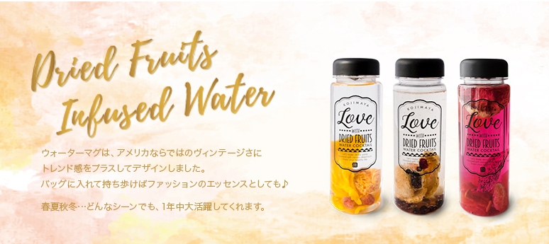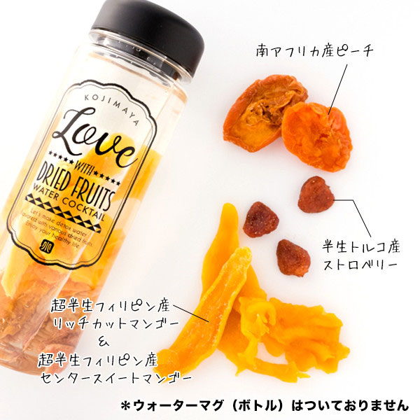 ミネラルウォーターにドライフルーツを入れるだけ!オリジナルウォーターマグと専用ドライフルーツミックス3種類のセットです。レジャーやスポーツにもぴったり☆