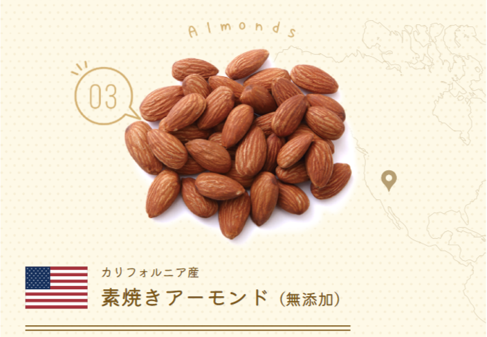 原材料:アーモンド(アメリカ産)・カシューナッツ(インド産)・クルミ(アメリカ産)・マカダミアンナッツ(オーストラリア産)・植物油・塩(えん藻昆布塩<長崎/新潟>・深海の華・クリスタル岩塩)