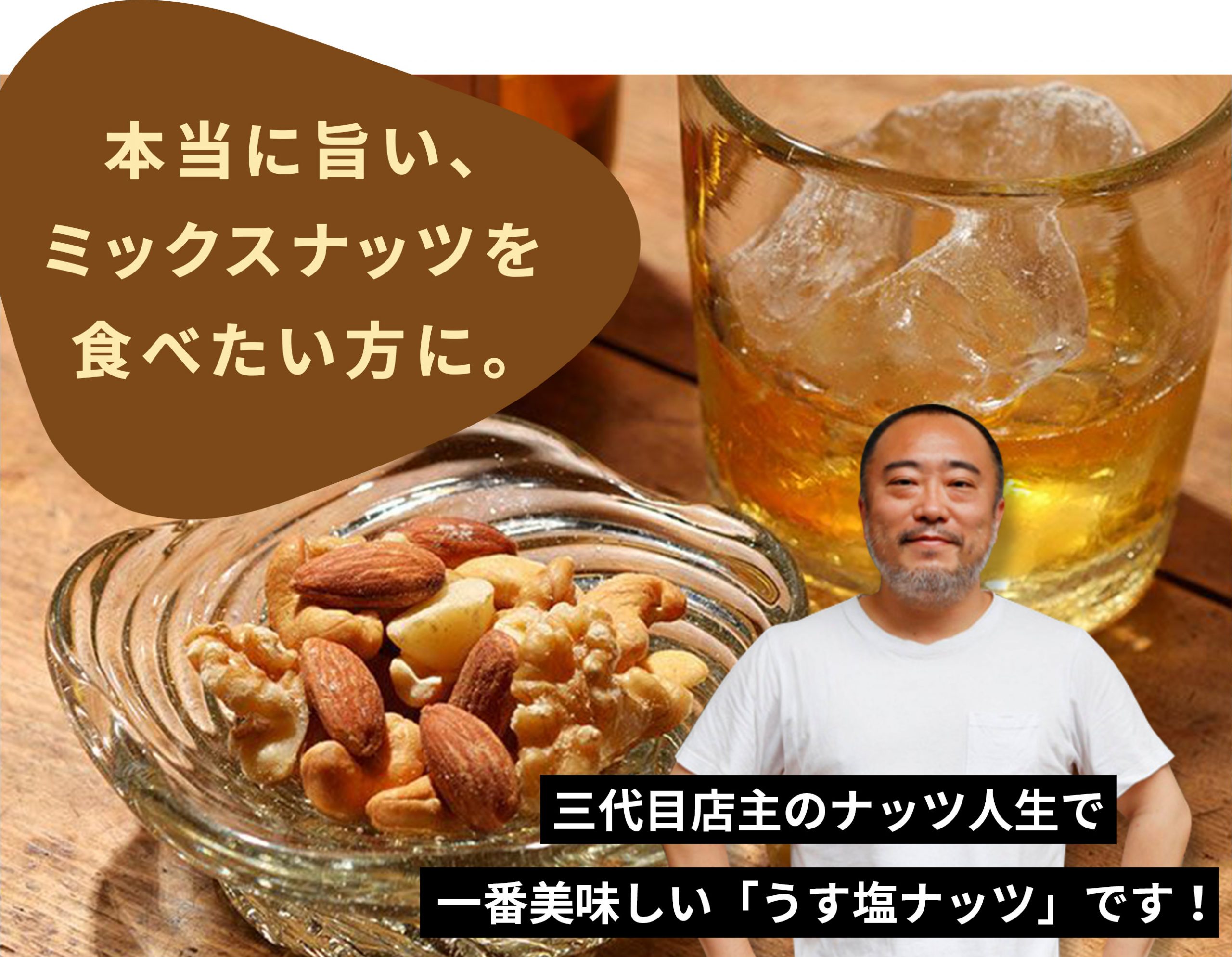 小島屋の看板人気商品のひとつとして、約60年間愛されてきた「うす塩ミックスナッツ」。実は、ナッツ好きな方ほど、「うす塩が好き!」とおっしゃる方も多いです。程よい塩味がナッツ本来の旨味・甘味を際立たせ、同時に個性の違うナッツに見事なハーモニーを生み出してくれます。ナッツの味を引き出す塩に注目してリニューアルした、うす塩ミックスナッツをご紹介します!