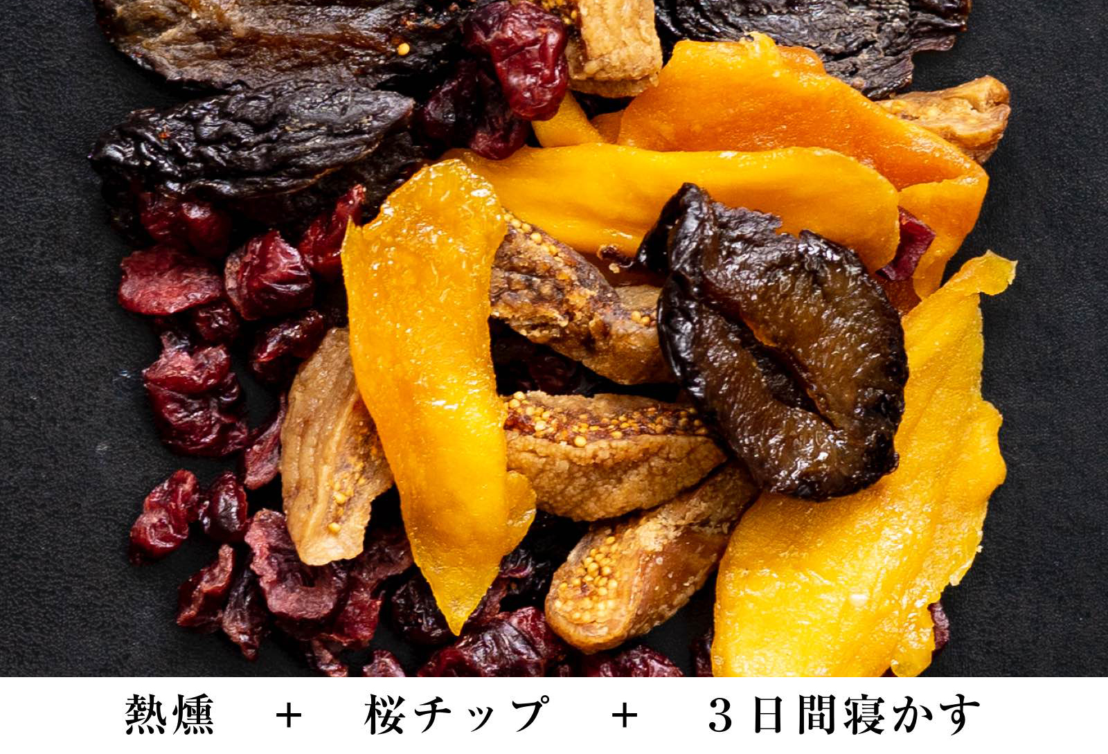 ドライフルーツは甘み、旨み、香りが強い為、もともと強いお酒への相性が良いです。それを更にスコッチという個性の強いお酒への相性に合わせる為、桜をベースにした7種類のフルーツ用オリジナルチップで燻製しました。