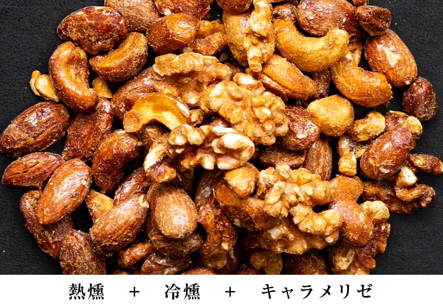 素焼きのナッツを温度の高い燻製(熱勲)する事で、ナッツ自体の甘みとコクを引き出します。使用するチップは桜をベースにした7種類のナッツ専用オリジナルチップ。