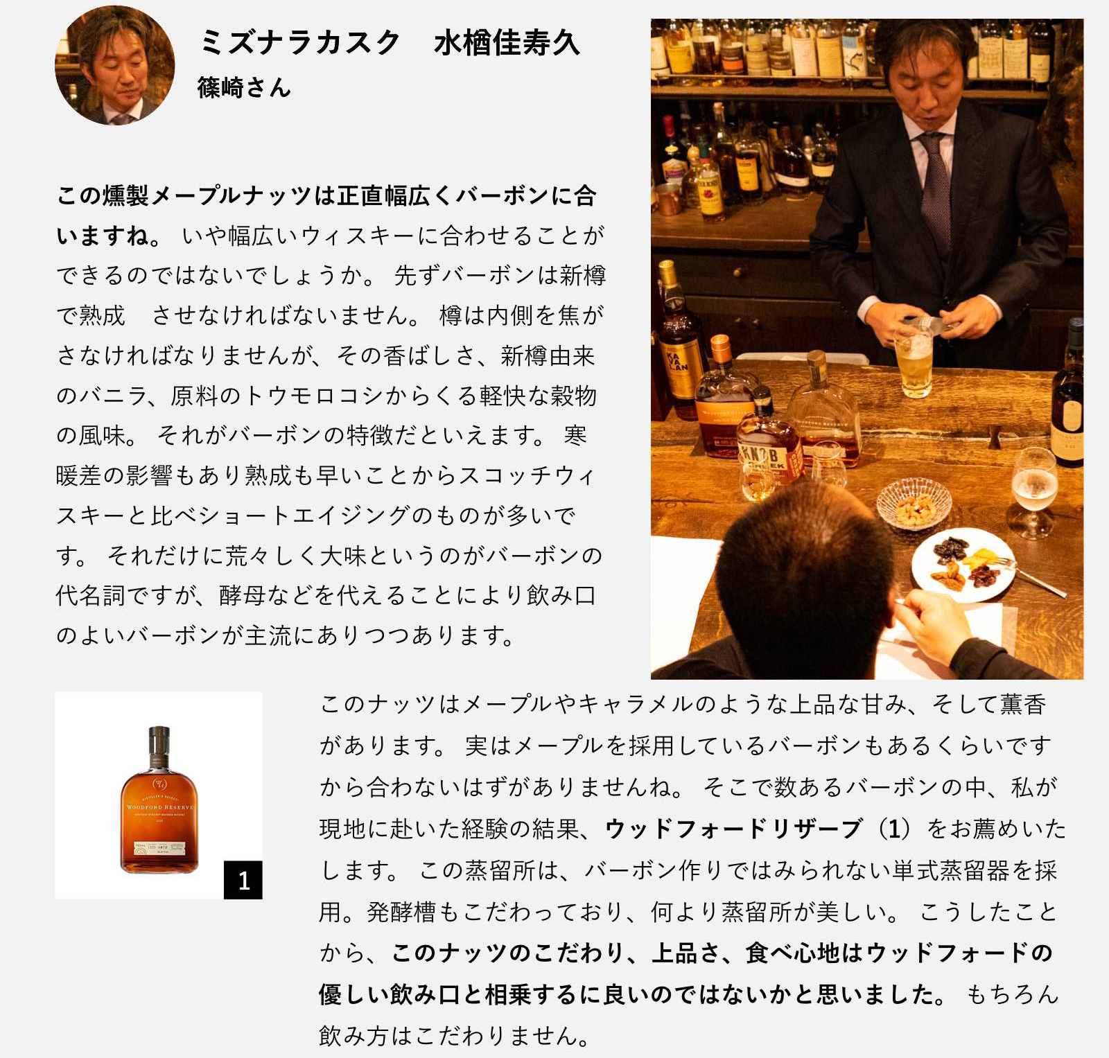 【バーボンの穀物の甘みが、ナッツとメープルの甘みと合う。しっかり纏った薫香でバーボンに負けない力強さ】