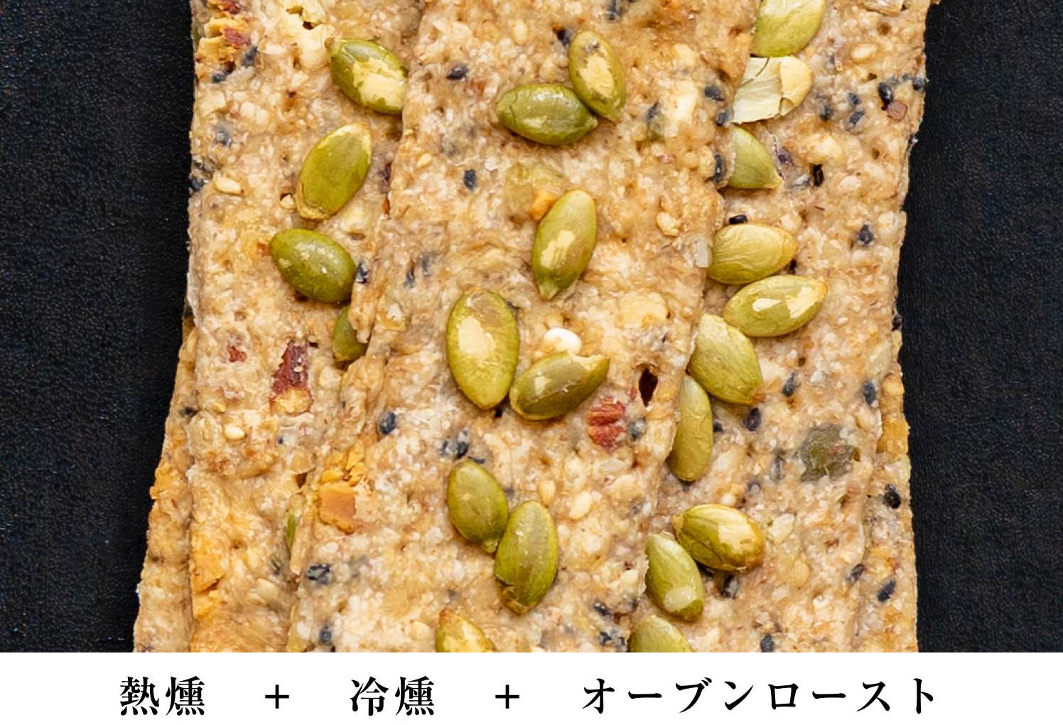 今回のクリスプブレッドは北海道江別産の小麦全粒粉と強力粉をベースに8種類の穀物、4種類の砕いた燻製ナッツ、そして燻製エクストラバージンオリーブオイルを練りこみ、燻製メープルシロップを塗り高温で焼き上げました。軽い口当たりを表現し、ほんのり薫香ばしい燻製香と強い穀物感があります。