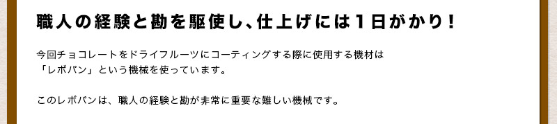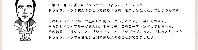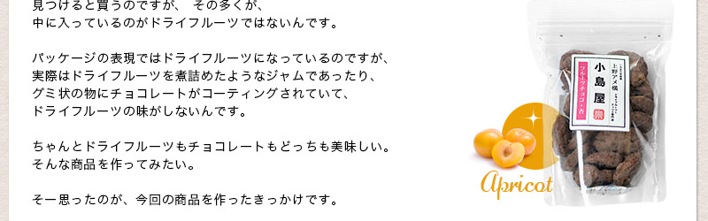 カルフォルニア産の高品質なアプリコットの香り、甘さ、そしてバランスの良い酸味が、チョコレートの中でもしっかりと生きています!!