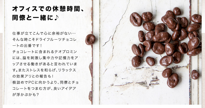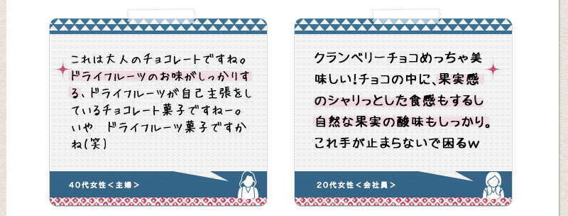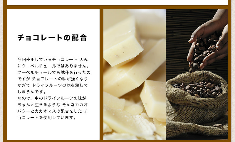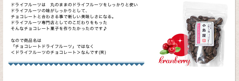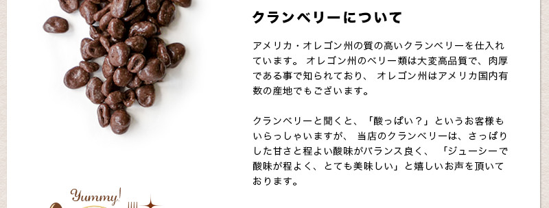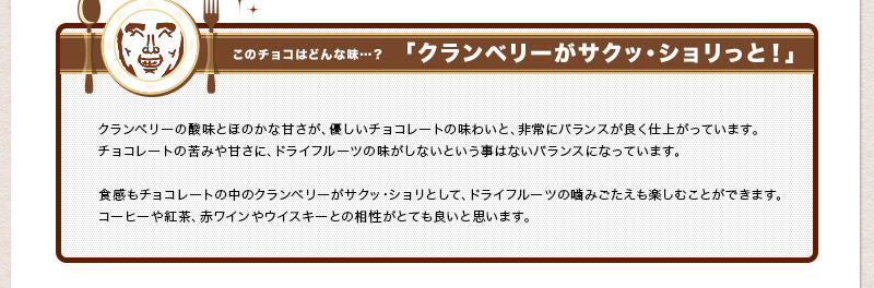 クランベリーの酸味とほのかな甘さが、優しいチョコレートの味わいと、非常にバランスが良く仕上がっています。
