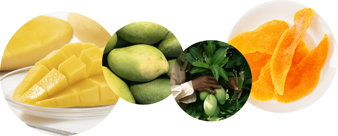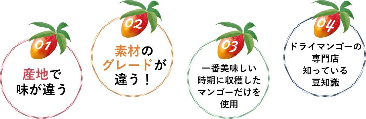 小島屋のドライマンゴーは、カンボジア、フィリピン、タイ、ガーナと4か国のマンゴーを使用しています。
