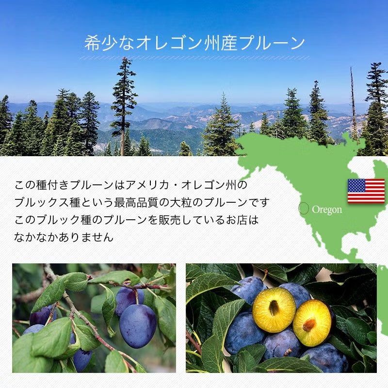 アメリカ・オレゴン州のブルックス種という大粒のプルーンです。この種付きプルーンは果肉がとても柔らかく、実離れの良い、最厳選のプルーンでブルックス種という品種です。甘いだけでなく、フルーツらしい酸味もあり、そして食感もよいプルーンの王様です。