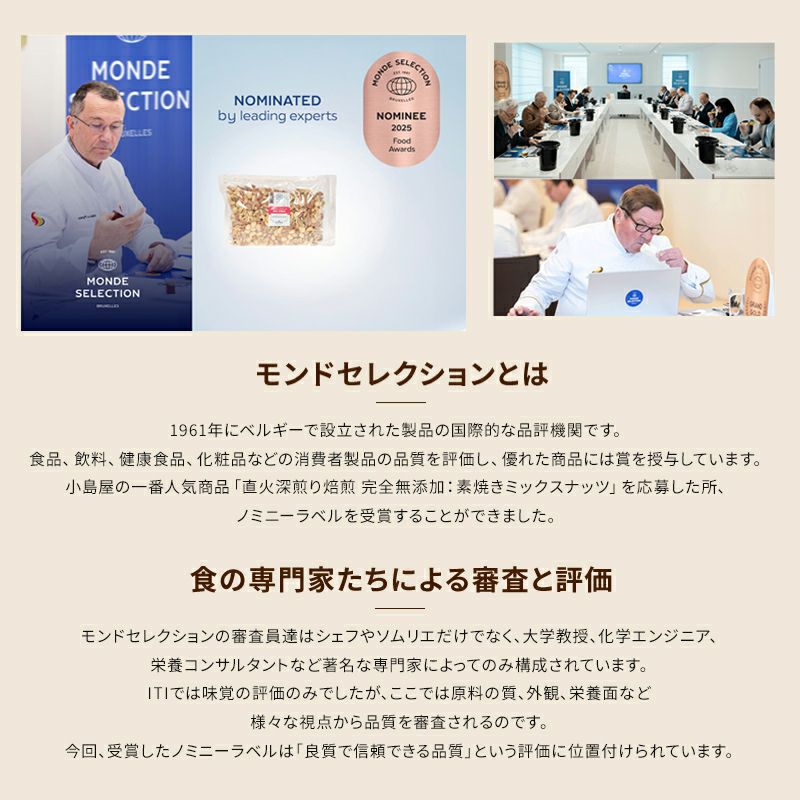 東京上野アメ横・小島屋専属の焙煎歴60年の熟練職人が無塩無油でローストした無添加の素焼きミックスナッツです。アーモンド・くるみ・カシューナッツ・マカダミアナッツの4種類。塩・油を使わずに無添加ローストなのでヘルシー。美容健康志向の方におすすめです。