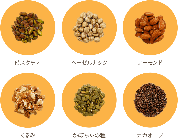 | アーモンド | くるみ | ピスタチオ | かぼちゃの種 | ヘーゼルナッツ | カカオニブ | |