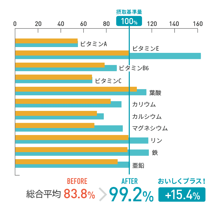 ナトリウムの摂りすぎに注意(平均147%) 特に摂りたい栄養 ・ナトリウムの排出を促すカリウム ・健康維持・免疫力・男性力に有効な亜鉛 ・疲労回復に有効なビタミンB群 ・加齢臭・老化の予防に有効な不飽和脂肪酸、ビタミンE |