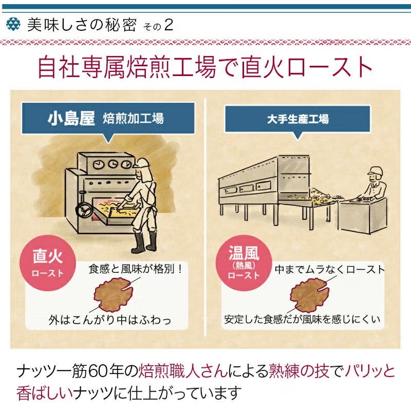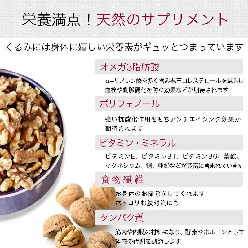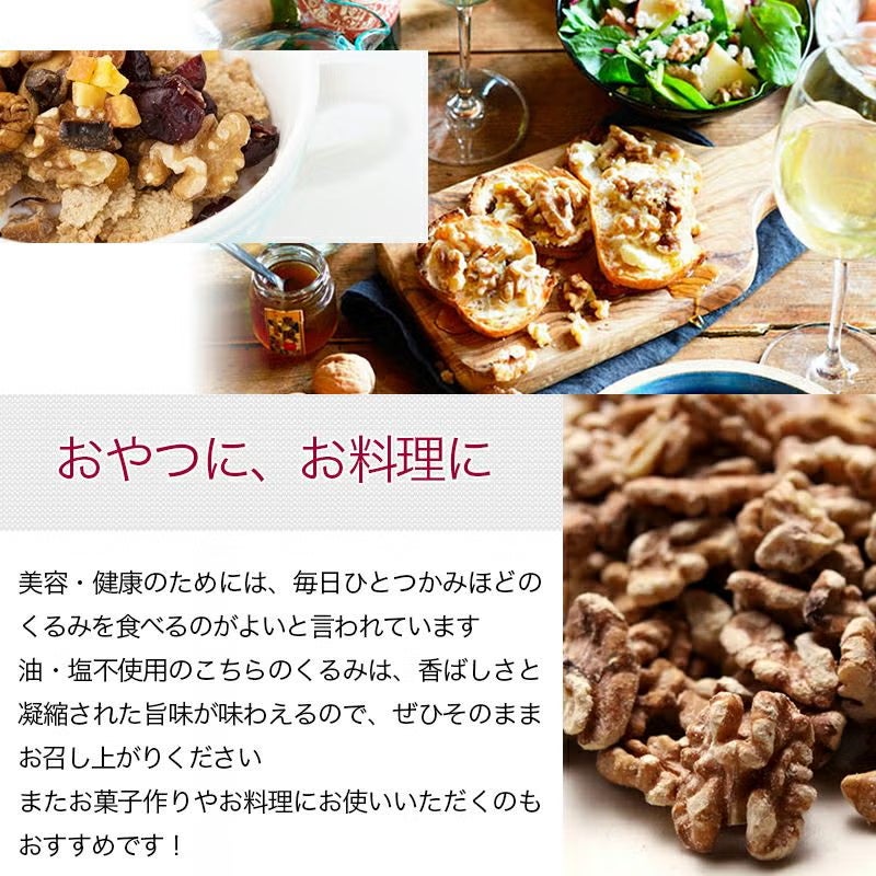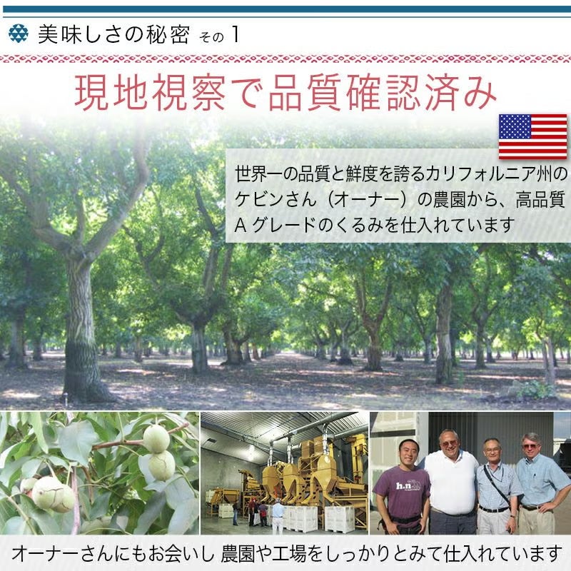 ◆小島屋の素焼きくるみの特徴 カルフォルニアの大自然の中で育った、栄養満点の無添加くるみです。くるみ畑も見に行き、農園のオーナー・ケビン社長ともお話をさせて頂いており、栽培・管理・品質の良いくるみを仕入れさせて頂いております。 そのAグレードのくるみを、職人暦60年の焙煎職人が無添加ローストしています。 ◆産地情報 世界一の品質と鮮度を誇る「アメリカ・カルフォルニア州」のグレードの高いAクラスの胡桃を仕入れております。 ◆味 油も塩も使わずに、無添加でローストしていますので、くるみ本来の味わいを楽しめます。 生に比べて煎る事でくるみの水分が減り、味が凝縮されますので、香ばしさに加え、味が若干ギュッとしまります。 ◆お召し上がり方 そのままお召上がり下さい。 ケーキやクッキー、パンに入れれば、存在感のある深い味にしてくれます。