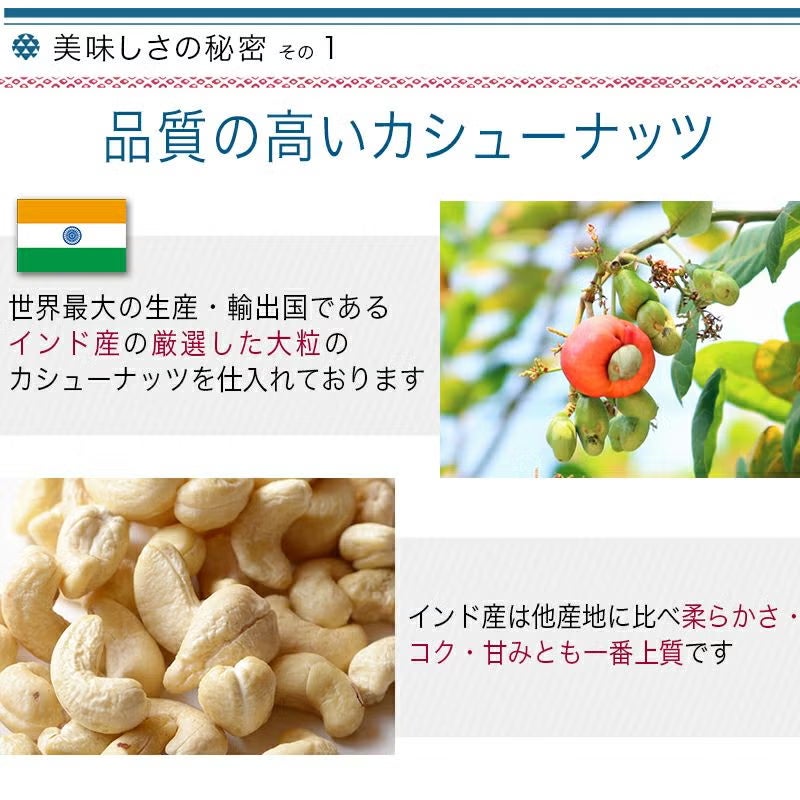 世界最大の産地であるインドから、選別した厳選なカシューナッツを仕入れており、1ポンド(453g)当り300~320粒の大きいサイズの商品を使用しています。