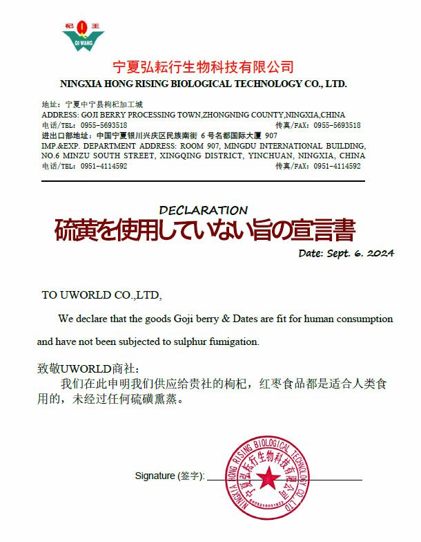「メーカーからの硫黄を使用していないという宣言書」 と 「残留農薬などの検査書」を添付させて頂きますので、ご確認いただければ幸いです。