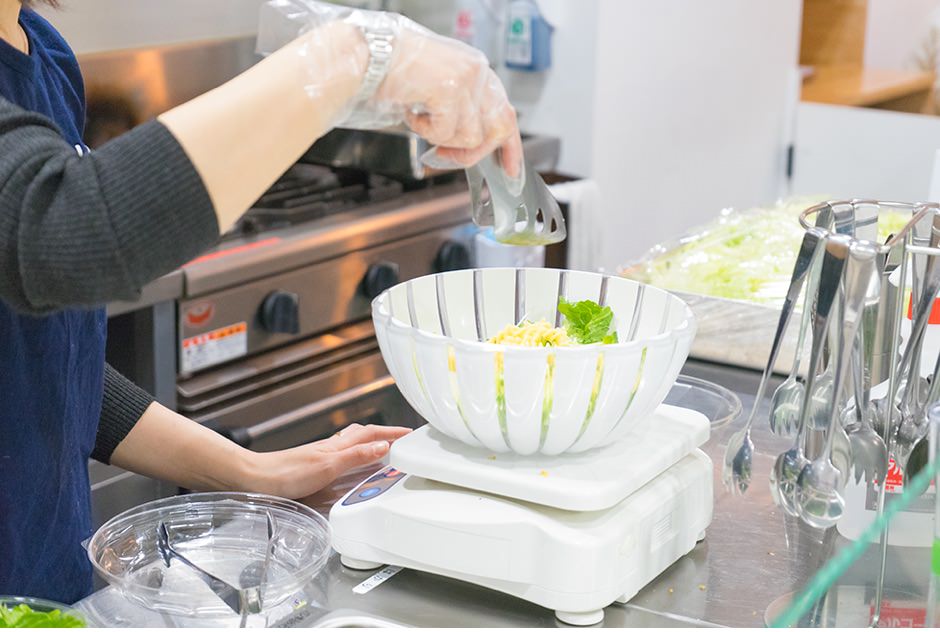 なので、オーダーを頂いてから、必要な野菜をカットしたりして、それをボールにいれて、 ドレッシングをいれて、良く混ぜ合わすことでまんべんなくサラダに味をつけていきます。