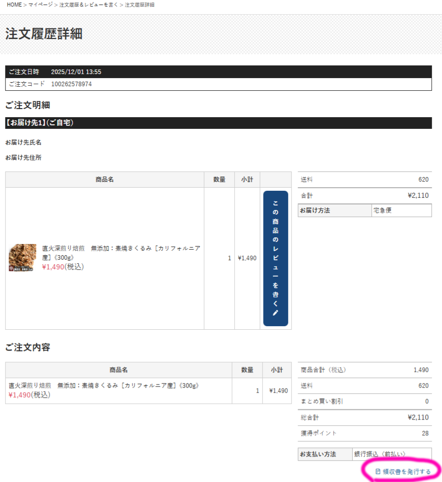 会員登録をされていないお客様は、マイページの履歴から備考欄へ領収書発行の旨<宛名や但し書き>をご指示いただければ幸いです。