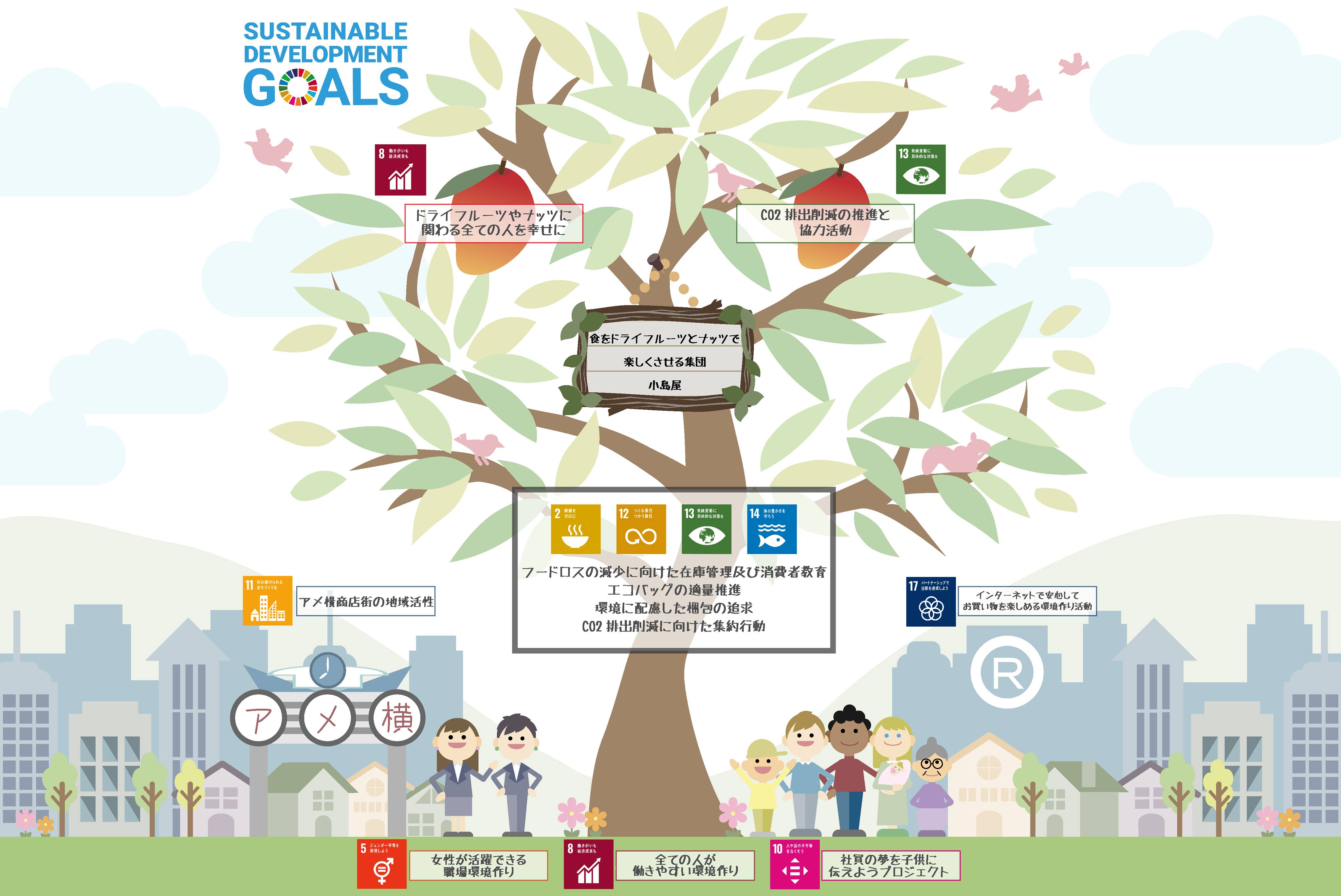 木の幹は小島屋のメインビジネスを通じた直接的な貢献を表しています。 果実は、メインビジネスを通じて間接的に行う貢献を表しています。