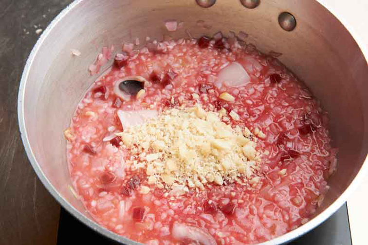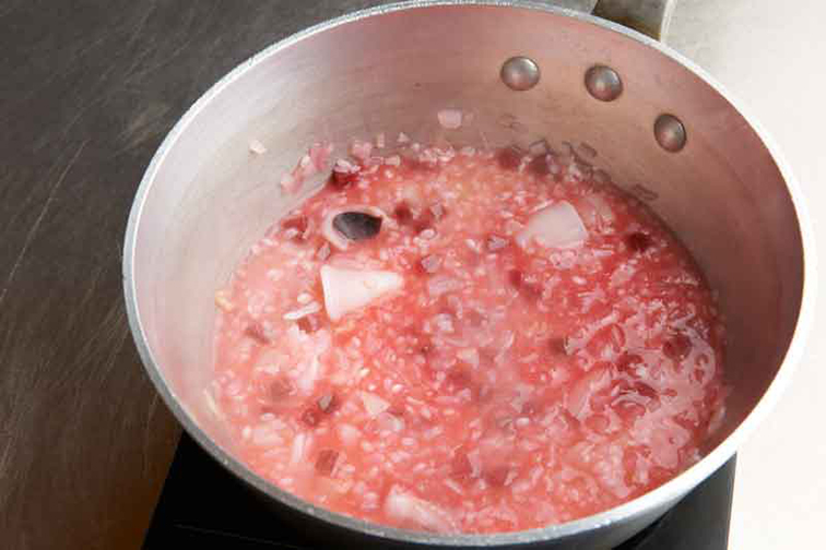 2、ビーツはお好みの大きさにカットし、1の鍋に加え、米を入れ2〜3分炒める。